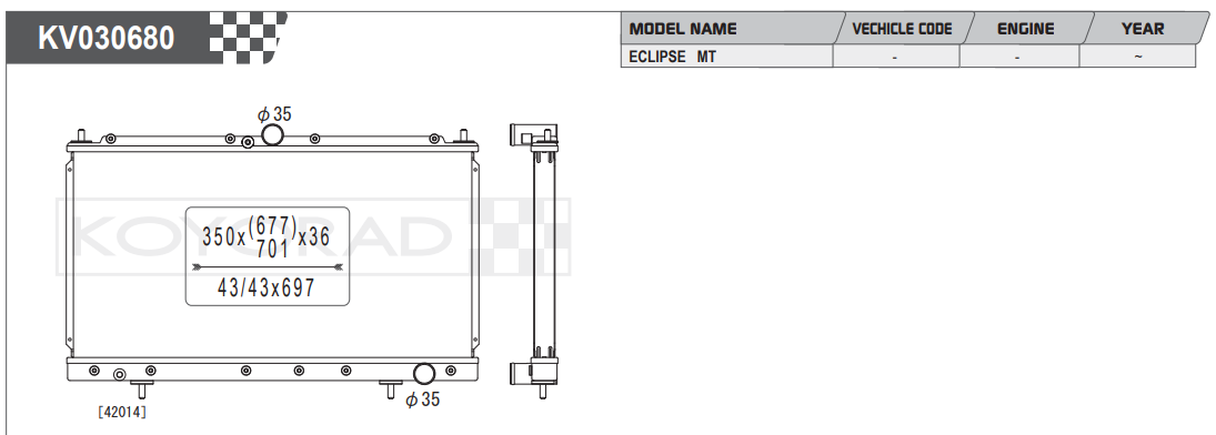 Upgrade your Mitsubishi Eclipse (1995–1999, manual transmission with 4G63T turbo) with the Koyorad Hyper V‑Series Alloy Radiator (KV030680 / VH030680). Crafted entirely in Japan from aircraft-grade aluminum, this radiator features a high-density 36 mm core and advanced N‑Flo triple-pass internal design, significantly enhancing coolant flow and heat dissipation—up to 50% more effective than stock units. The radiator is precision TIG-welded and Nocolok-brazed, offering durability and reliability under daily driving and demanding track conditions . It installs as a direct-fit replacement using factory brackets, fans, hoses, and shrouds—no modifications required. Ideal for 4G63T builds prioritizing thermal efficiency and OEM-style fitment.